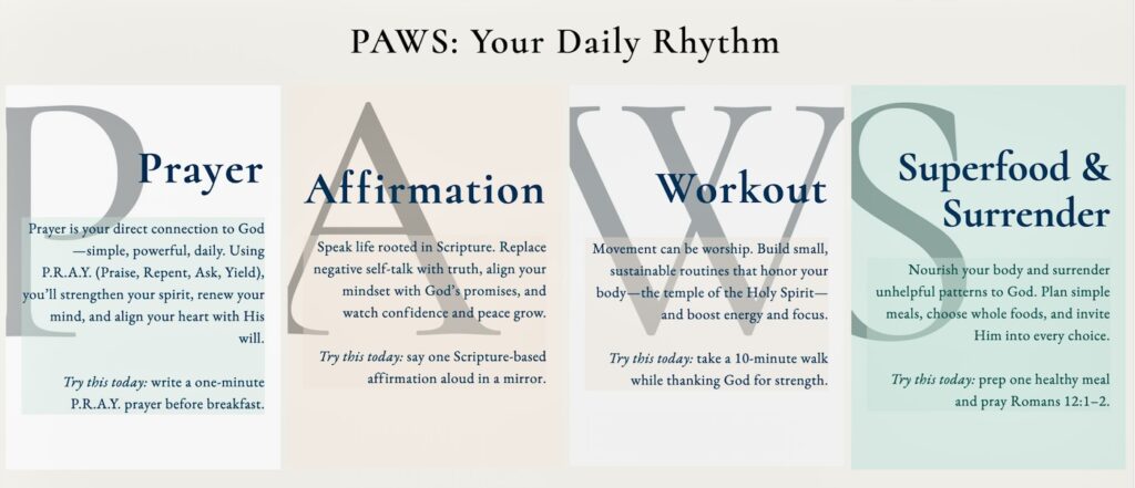 Prayer is also how we begin our day with strength and intention. When we start our mornings in prayer, we invite God into our energy, our discipline, and our choices before the day begins. This is why prayer is the foundation of the PAWS model. Before affirmations shape our thoughts, before workouts strengthen our bodies, and before surrender teaches us trust, prayer aligns our body, mind, and spirit. When we pray first, we move in God’s strength—not our own.